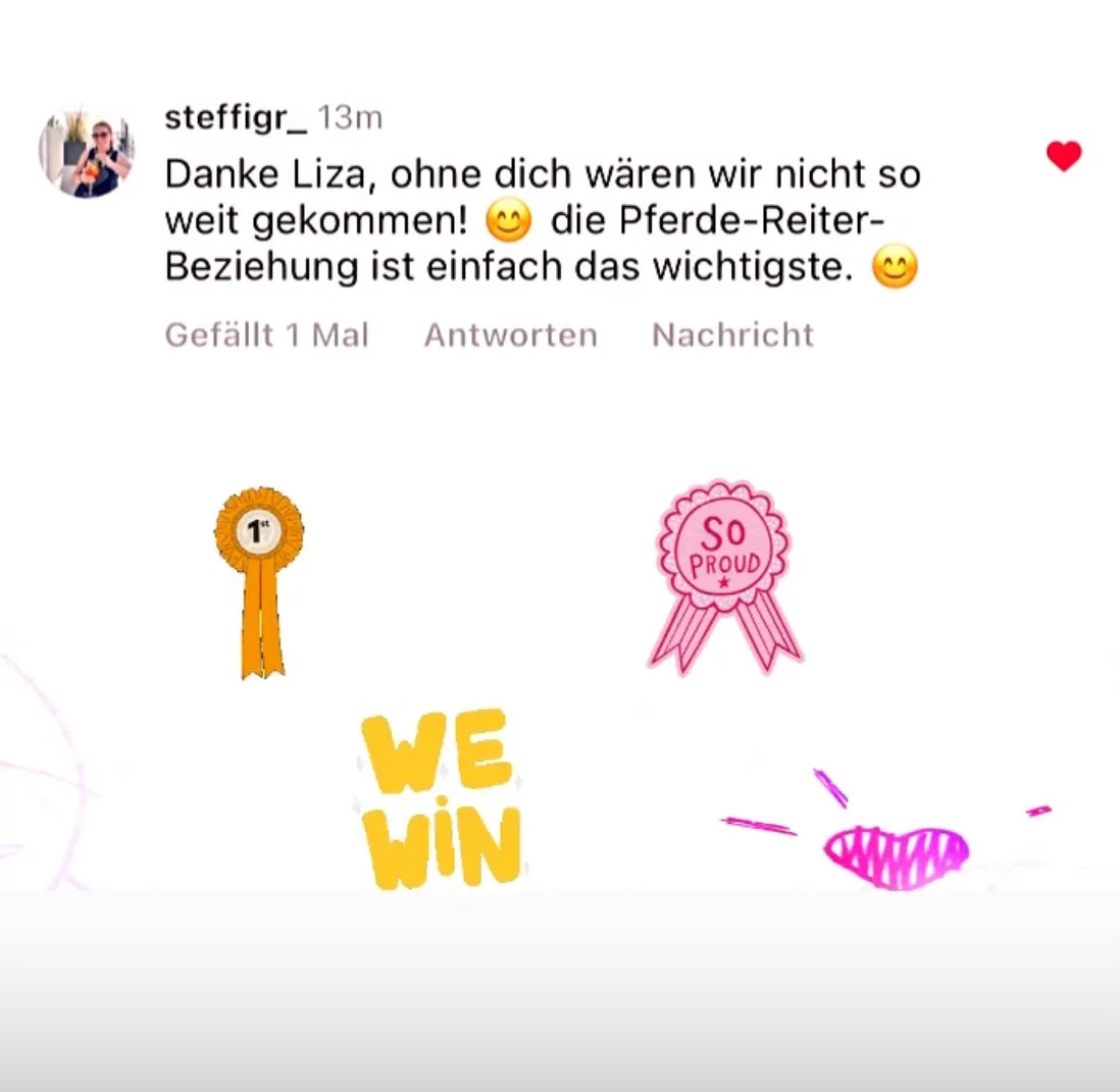 Meine absolute Passion ist es, die Kommunikation zwischen Pferd und Reiter zu verbessern und zu verfeinern. Die Grundlage für eine positive Entwicklung ist dabei, dass BEIDE Parteien Spaß am Reiten haben, gerne mitarbeiten und verstehen, was, wie und warum funktioniert. Ich hole Euch da ab, wo ihr steht und begleite Euch sehr gerne auf Eurem Weg zum harmonischen Miteinander - ob als Turnierreiter oder ambitionierter Freizeitreiter.