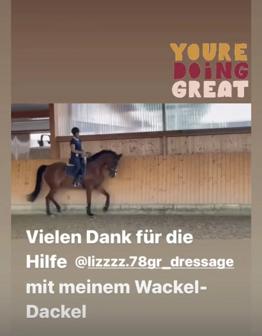 Ein besonderes Pferd mit viel Qualität, jedoch mit Anlehnungsschwierigkeiten. Hier war das 1. Ziel Rhythmus und Balance zu verbessern. Glücklicherweise eine sehr gefühlvolle Reiterin, die meine Anleitungen super umsetzen kann und wir somit recht schnell kleine Erfolgserlebnisse herbeiführen konnten. Ich freu mich sehr auf die weitere Begleitung der beiden